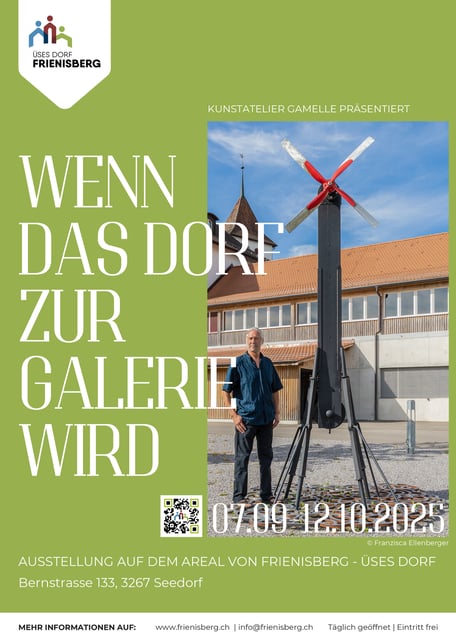 Es ist mir eine grosse Freude, euch zu meiner kommenden Einzelausstellung «Frienisberg wird zur Galerie – Frischer Wind» einzuladen. Vom 7. September bis 12. Oktober 2025 verwandelt sich das Dorf Frienisberg in einen besonderen Ausstellungsraum – mit grossen Skulpturen auf dem Dorfplatz und kleineren Objekten im historischen Kreuzgang der ehemaligen Klosteranlage.